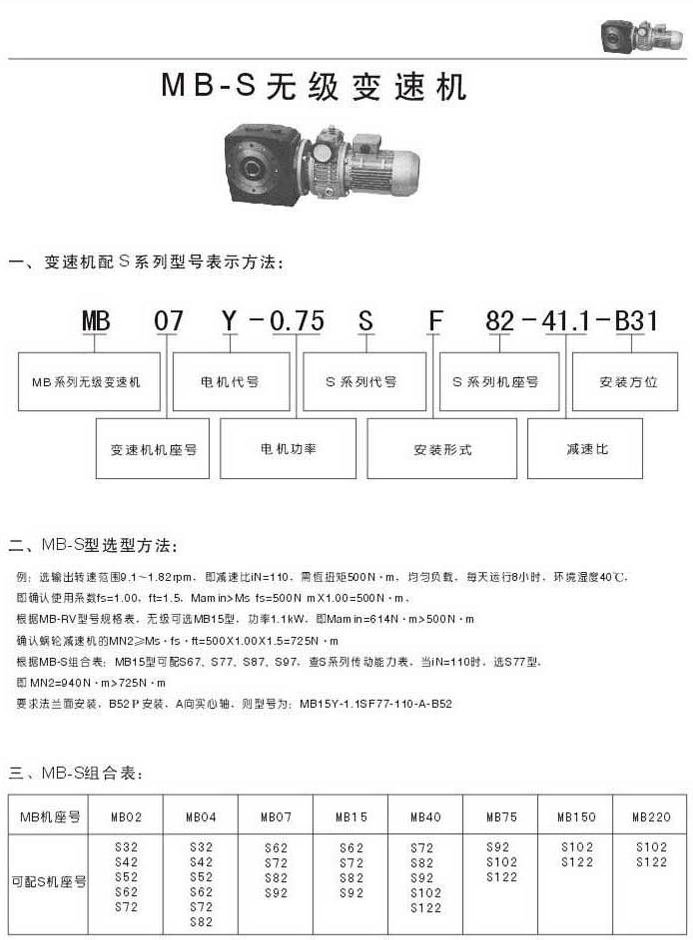 MB-S無級變速機(jī)型號表示法選型方法MB-S組合表